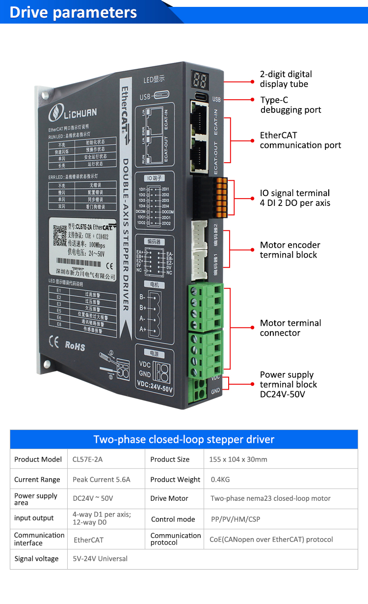 EtherCAT 2Phase Nema24 4-assige DC stappenmotordrivers met gesloten lusNieuwe producten EtherCAT 2Phase Nema23 2-assige DC stappenmotordrivers met gesloten lus gemaakt in China met CE/ROHS van LICHUAN®. Onze fabriek is een beroemde EtherCAT 2Phase Nema23 2-assige DC Closed Loop stappenmotor driver kit fabrikanten en leveranciers in China. Ons product is van hoge kwaliteit/duurzame/stabiele werking en goedkope prijs. En wij leveren maatwerk.