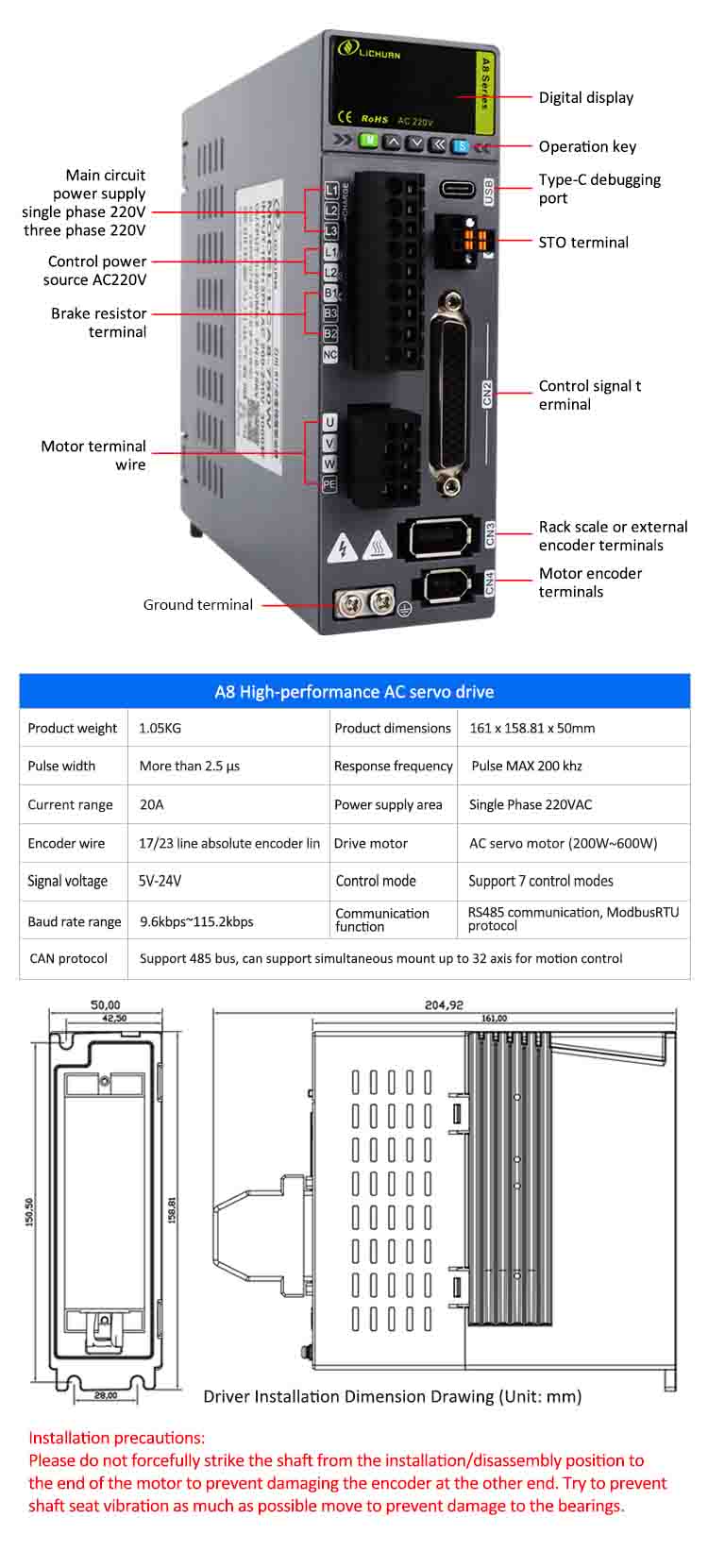 Door een geoptimaliseerd ontwerp, verbeterde koppeloutput en een stabiele 220V AC-voedingsstructuur biedt het Lichuan A8-systeem uitstekende efficiëntie en soepele bewegingen voor zowel OEM-fabrikanten als systeemintegrators.